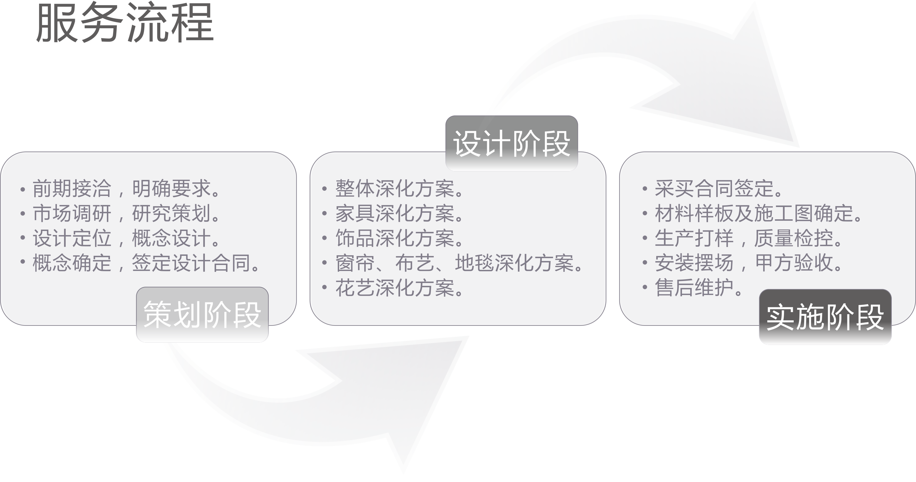 1、前期接洽,明確需求:與甲方深入溝通,并根據(jù)甲方提供平面圖與效果圖,乙方對(duì)相應(yīng)空間的行為要求進(jìn)行分析、研究;;